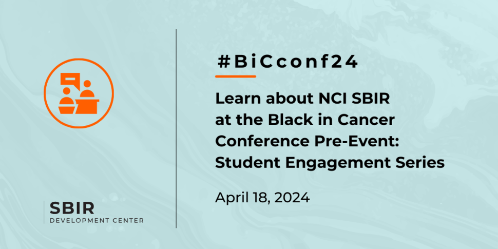 Join us on Thursday, April 18, 2024, from 1:00-3:00 p.m. ET as NCI SBIR hosts an informational webinar as part of the Black in Cancer Student Engagement Series. Program Directors Patricia Weber, DrPH, and Melissa Li, PhD, will introduce to attendees the NCI SBIR funding opportunities, pre-Phase I support, and SBIR/STTR application fundamentals to support early-stage biotech innovators. Following the presentation, attendees will have the chance to meet one-on-one with presenters. If you are interested, please send your information (name, affiliation, and program questions/technology information if available) to Jenelle Azore (jenelle.azore@nih.gov) by Thursday, April 11, 2024.